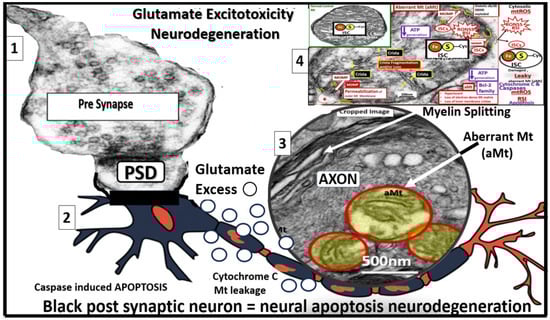 Glutamate excitotoxicity. Image 1 demonstrates a normal presynaptic neuron with multiple neurotransmitter vesicles. Image 2 depicts a blackened postsynaptic degenerative neuron due to glutamate excitotoxicity (open circles, accumulation of glutamate) promoting apoptotic neurodegeneration via excessive calcium and neurotoxicity. Image 3 depicts a transmission electron micrograph of an axon with three aberrant mitochondria (aMt) and myelin splitting. Image 4 depicts a compressed leaky aMt from previous Figure 7 that is responsible for excessive mtROS and calcium excess. Also, note the 10 steps involved with glutamate excitotoxicity to result in synaptic dysfunction and neurodegeneration as listed in Box 2. ATP, adenosine triphosphate; Ca++, calcium; GL, glutamate; Mt or mt, mitochondria; mtROS, mitochondrial reactive oxygen species.
