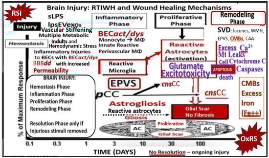 Late-onset Alzheimer’s disease (LOAD) and the brain injury: response to injury wound healing (BI:RTIWH) mechanism. While LOAD is considered to be a multifactorial disease, its initial injuries may be derived at the level of the brain endothelial cell of the neurovascular unit. However, the initial injury to neurons is thought to arise from the accumulation of misfolded proteins, which includes extracellular neurotoxic oligomers or plaques of amyloid beta (Aβ (1–42)) and intracellular tau neurofibrillary tangle(s) (NFTs) [11,12,13]. There are five basic phases in this BI:RTIWH mechanism that include 1. hemostasis; 2. inflammation; 3. proliferation; 4. remodeling; 5. resolution. Note that only phases 1–4 are shown and that the resolution phase is not included in this illustration because injurious stimuli are not removed in the development and progression of LOAD. Also, note that glutamate excitotoxicity and its subsequent effects leading to neuronal apoptosis and neurodegeneration are in purple color. Modified image provided with permission by CC 4.0 [104]. AC, astrocyte; act, activation; BECs, brain endothelial cells; CAA, cerebral amyloid angiopathy; Ca2+, calcium; CC, cytokines and chemokines; CMBs, cerebral microbleeds; CNS, central nervous system; cnsCC, central nervous system cytokines, chemokines; dys, dysfunction; EPVS, enlarged perivascular spaces; lpsEVexos, lipopolysaccharide extracellular vesicle exosomes; MetS, metabolic syndrome; MΦ, macrophage; Mt, mitochondria; pCC, peripheral cytokines/chemokines; SVD, cerebral small vessel disease; T2DM, type 2 diabetes mellitus.