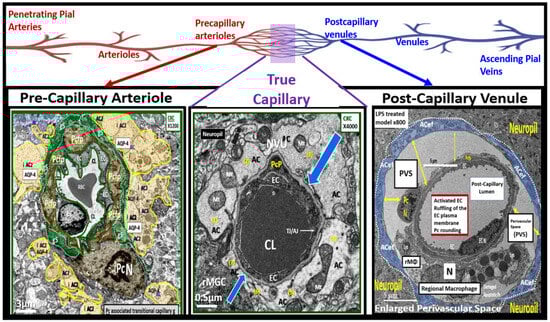 True capillaries as in Figure 11 are unique in that the pia membrane (glia limitans) abruptly ends at the true capillary, and, therefore, true capillaries do not have perivascular space(s) (PVSs). Importantly, true capillaries are responsible for the uptake of nutrients, oxygen, and water and the efflux of metabolic waste [139,140,141], while post-capillary venules with their perivascular space(s) (PVSs) serve as a conduit for interstitial metabolic waste disposal via the PVS or glymphatic system. Additionally, the PVSs of the postcapillary venules allow for the transmigration of immune cells (innate and adaptive leukocytes) into the CNS parenchyma, as described by Owens et al. [142]. This strongly implicates the PVS in the two-step process of neuroinflammation, with step one consisting of circulating immune cells rolling, adhering, and transmigrating across the BECs of post-capillary venules and, step two, the progression of immune cells across the PVS and migration across the ACef basement membrane into the CNS parenchymal interstitium (Figure 12) [103,141,142].