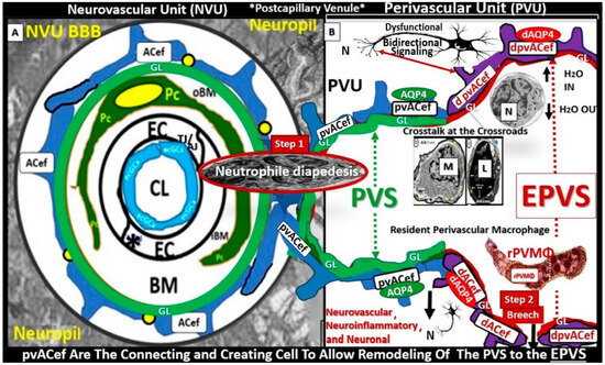 True capillary neurovascular unit (NVU) compared to the postcapillary venule perivascular unit (PVU). Protoplasmic perivascular astrocyte endfeet (pvACef) (pseudo-colored blue) within the true capillary (A) represent the creating and connecting ability of these cells, which allow remodeling of the normal PVU (B) and perivascular spaces (PVSs) to remodel into the pathologic enlarged perivascular space (EPV) that measures 1–3 mm on magnetic resonance imaging. (A) schematic illustrates the pseudo-colored blue true capillary neurovascular unit NVU (illustrating the transmission electron microscopic TEM true capillary image in Figure 11). Note that when the brain endothelial cells (BECs) become activated and NVU BBB disruption develops, due to BEC activation and dysfunction (BECact/dys) (due to multiple injurious species, which includes peripheral inflammation), there develops an increased permeability of fluids, peripheral cytokines and chemokines, and peripheral immune cells within the neutrophile (N) depicted herein penetrating the tight and adherens junction (TJ/AJ) paracellular spaces to enter the postcapillary venule along with monocytes (Ms) and lymphocytes (Ls) into the postcapillary venule PVS of the PVU B for step one of the two-step process of neuroinflammation. (B) depicts the postcapillary venule that contains the PVU. The PVU includes the normal PVS, which has the capability to remodel to the pathological EPVS. Notably, the proinflammatory leukocytes enter the PVS along with fluids, solutes, and cytokines/chemokines from an activated, disrupted, and leaky NVU in A. Further, note the pvACef (pseudo-colored blue) and its glia limitans (pseudo-colored cyan in the control NVU in (A) to the cyan color with exaggerated thickness for illustrative purposes in (B) that faces and adheres to the NVU BM extracellular matrix and faces the PVS PVU lumen that then becomes pseudo-colored red to denote the development of the EPVSs). Note that the pvACef have detached and separated, which allow for the creation of a perivascular space that transforms to an EPVS. The glia limitans becomes pseudo-colored red once the EPVSs have formed and then become breeched due to activation of matrix metalloproteinases and degradation of the proteins in the glia limitans. This remodeling allows neurotoxins and proinflammatory cells to leak into the interstitial spaces of the neuropil to mix with the ISF and result in neuroinflammation (step two) of the two-step process of neuroinflammation. Note that the dysfunctional pvACef AQP4 water channel is associated with the dysfunctional bidirectional signaling between the neuron (N) and the dysfunctional pvACef AQP4 water channel. Image provided by CC 4.0 [103]. AQP4 = aquaporin 4; asterisk = tight and adherens junction; BBB = blood–brain barrier; BM = both inner (i) and outer (o) basement membrane; dACef and dpvACef = dysfunctional astrocyte endfeet; EC = brain endothelial cell; ecGCx = endothelial glycocalyx; EVPS = enlarged perivascular space; fAQP4 = functional aquaporin 4; GL = glia limitans; H2O = water; L = lymphocyte; M = monocyte; N = neutrophile and neuron; Pc = pericyte; PVS = perivascular space; PVU = perivascular unit; rPVMΦ = resident perivascular macrophage; TJ/AJ = tight and adherens junctions.