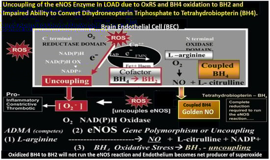 RONSSs are known to be important signaling molecules in health. However, excessive RONSSs as manifested by OxRS are damaging to proteins, lipids, carbohydrates, and nucleic acids as presented in Section 2. OxRS acts as an injury that instigates the classic BI:RTIWH mechanism cascade as presented in Figure 10. These BI:RTIWH mechanisms result in neuroinflammation (acute and/or chronic) phase, granulation–proliferation phase with astrogliosis and angiogenesis, and a remodeling phase. Concurrently, this OxRS results in BECact/dys, in which dysfunction manifests as decreased BEC-derived NO bioavailability via eNOS enzyme uncoupling. Homeostatic endothelial nitric oxide synthase enzyme (eNOS) coupling is dependent on the proper functioning of the essential tetrahydrobiopterin (BH4) cofactor [137,138]. The totally reduced form of BH4 is known to be an essential requisite cofactor to allow the eNOS to run and allow the synthesis of the vasodilatory gasotransmitter nitric oxide (NO) (Figure 13) [24,25,27,28,29,30,137,138,143,144,145].