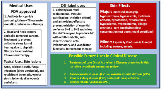 Intravenous STS has been used in human individuals to prevent ototoxicity since 1985 via its known antioxidant effects against cisplatin with a dosage of 20 g per square meter, administered intravenously over a 15-min period, 6 h after the discontinuation of cisplatin [147]. Additionally, intravenous STS treatment paradigms for individuals with chronic-renal-failure-related hemodialysis and calciphylaxis have been previously described [23,24,25,26,27,28,29,30]. Importantly, in most studies, intravenous STS administration was provided as an add-on treatment to other standard treatment protocols for calciphylaxis. Most studies have supported the use of intravenous STS at a dosage of 25 g (two 12.5 g vials diluted in 100 cc of normal saline) during the last hour of hemodialysis, three times per week, and some suggest that 12.5 g per 100 cc of normal saline be used initially over a one-hour infusion as a test dose initially and, if tolerated, proceed to 25 g [23,24,148,149,150,151,152,153,154,155,156,157,158,159,160,161,162]. Additionally, STS has been used with peritoneal dialysis [146] and in pediatric patients (25 g/1.7 m2) [163]. There is considerable neuropathic pain that is associated with the ischemic skin and subcutaneous lesions of calciphylaxis that are magnified during hemodialysis. This pain is thought to be the result of subcutaneous and skin ischemia that associates with subcutaneous vascular and endoneurium calcification [24]. One of the qualities of STS multi-targeting treatments in these individuals with calciphylaxis was the rapid relief of this severe neuropathic pain, and this has been thought to be due to the restoration of the pathologic microvascular eNOS uncoupling, which associates with vascular ischemia and associated vascular and endoneurium calcification [24,30].