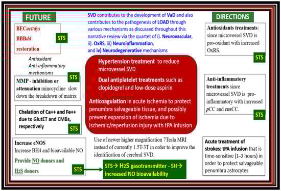 Additionally, STS and H2S via their antioxidant and anti-inflammatory mechanisms will aid in promoting the restoration of normal BEC NO production and BBB function to result in an attenuation of the increased permeability associated with LOAD. Once STS and H2S have restored BECact/dys and BBBdd, the enlarged perivascular spaces that associate with impaired clearance of Aβ oligomers, Aβ, and tau proteins will undergo improved clearance and result in a decrease in AB and tau with the attenuation of neurotoxicity and neurodegeneration [102,146].