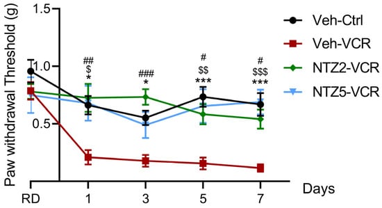 Effects of netazepide (2 or 5 mg/kg) on mechanical allodynia induced by vincristine in mice. Mechanical sensitivity was evaluated using the von Frey filament test at D1, D3, D5, and D7. n = 10 mice per group, * p < 0.05, *** p < 0.001, Veh-VCR vs. Veh-Ctrl. $ p < 0.05, $$ p < 0.01, $$$ p < 0.001, Veh-VCR vs. NTZ5-VCR, # p < 0.05, ## p < 0.01, ### p < 0.001 Veh-VCR vs. NTZ2-VCR, RD: reference day, Ctrl: control; NTZ2: netazepide at 2 mg/kg; NTZ5: netazepide at 5 mg/kg; Veh: vehicle; VCR: vincristine.