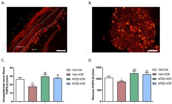 Effect of netazepide (2 or 5 mg/kg) on the loss of sensory nerve endings and neurons induced by vincristine in mice. Immunohistochemistry for PGP9.5 was performed on paw skin sections (A) and DRG (B). (C) Intraepidermal nerve fiber density was assessed. Three sections of paw skin were examined per mouse. n = 6 mice. (D) Quantification of DRG neuron density was evaluated. Three DRG sections and three DRG per mouse were counted. n = 6 per group. * p < 0.05, ** p < 0.01 vs. Veh-Ctrl; ## p < 0.05 vs. Veh-VCR. PGP9.5: protein gene product 9.5. Ctrl: control, NTZ2: netazepide at 2 mg/kg, NTZ5: netazepide at 5 mg/kg, Veh: vehicle, VCR: vincristine.