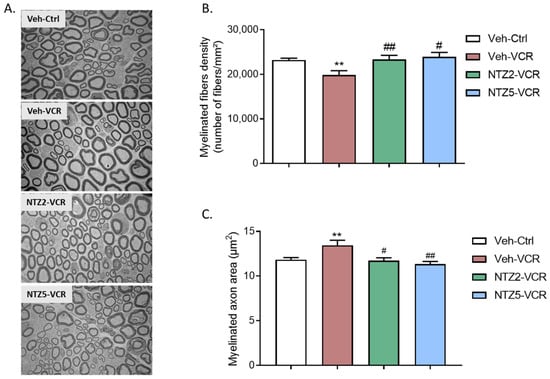 Neither dose of netazepide had any noticeable effect on the morphology of myelinated or unmyelinated nerve fibers in the sciatic nerves of the control groups. However, there was no significant alteration in the morphology of unmyelinated fibers. (Figure 3A) in Veh-VCR mice relative to Veh-Ctrl mice. Quantitative analysis of electron microscopy images revealed a significant reduction in myelinated fiber density following vincristine treatment. (p = 0.0076, Figure 3B). This reduction was linked to an augmentation in the area of myelinated axons. (p < 0.01, Figure 3C). Netazepide prevented the decrease in myelinated fiber density at 2 or 5 mg/kg (p = 0.0206, Figure 3B) and the increase in myelinated axon area induced by vincristine (NTZ2-VCR: p = 0.0313, NTZ5-VCR: p = 0.0043 vs. Veh-VCR), such that there was no significant difference between the myelinated axon areas of mice in the Veh-Ctrl, VCR-NTZ2, and VCR-NTZ5 groups (Figure 3C).