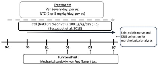 Peripheral neuropathy was induced through daily intraperitoneal [i.p.], injections of vincristine at a dosage of 100 µg/kg for 8 consecutive days (Hospira, Meudon, France) [36], or an equivalent volume of the diluent (saline solution, i.p.) for Ctrl mice (Figure 4).