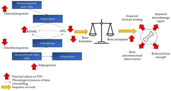 Bones are perpetually remodelling tissues that serve essential roles in sustaining human life such as providing mechanical support, permitting locomotion, protecting vital organs and being the main haematopoietic organ for adults. Therefore, the continuous remodelling of bone to preserve its strength and avoid the accumulation of damage is vital for optimal functioning [31,32]. Bone remodelling is essentially a process where osteoclasts resorb old or damaged bone and osteoblasts form new bone [33]. In this review, the effects of TDF on various aspects of bone quality through modulation of bone remodelling are discussed.