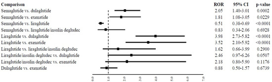 From the disproportionality analysis, statistically significant differences emerged for semaglutide or liraglutide compared to other GLP1 RAs. In particular, the probability of reporting suicidal events was found to be higher for semaglutide than dulaglutide (ROR, 2.05; 95%CI, 1.40–3.01) or exenatide (ROR, 1.81; 95%CI, 1.08–3.05) and higher for liraglutide than dulaglutide (ROR, 3.98; 95%CI, 2.73–5.82) or exenatide (ROR, 3.52; 95%CI, 2.10–5.92). On the contrary, the reporting probability was found to be lower for semaglutide than liraglutide (ROR, 0.51; 95%CI, 0.38–0.69). All other comparisons did not show statistically significant differences (Figure 1).