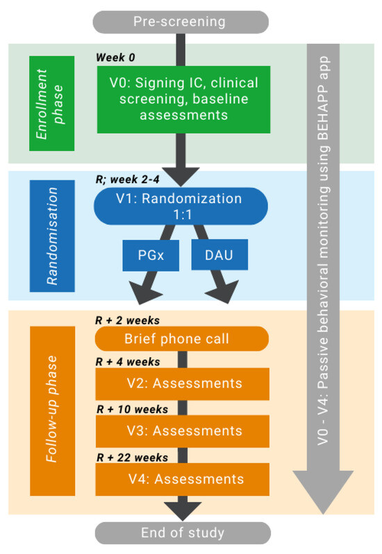 Study flow chart. The study period comprises 24–26 weeks and includes a baseline visit, a randomization visit, three follow-up visits, and a phone call. Behavioral monitoring using the Behapp application [54] will be conducted during the whole study period. Baseline visit (V0) and Visit two assessments include somatic measurements (ECG, blood sampling, weight, blood pressure, heart rate), clinical modulators, and questionnaires. Visit 3 (V3) and 4 (V4) assessments include clinical modulators, anthropometric measurements (weight, blood pressure, heart rate), and psychometric questionnaires. Abbreviations: IC = informed consent; DAU = dosing as a usual group; PGx = pharmacogenetic-guided group; R = randomization; V = visit.