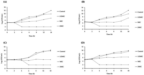 The time–kill study was performed to examine the bactericidal kinetics of LysAB1245 on P. aeruginosa (PA01 and K1455) and S. aureus (MRSA NPRC 001R and ATCC 25923) strains. The results revealed that LysAB1245 showed the concentration-dependent killing of all tested strains (Figure 1). LysAB1245 at 2MIC (9.36 µg/mL) reduced the bacterial viability of both P. aeruginosa PA01 and K1455 strains by more than 4 log CFU/mL or 99.99% within 4 h (Figure 1A,B). In addition, LysAB1245 at 2MIC (18.72 µg/mL) exhibited bactericidal effects on MRSA R001, resulting in an approximately 4 log CFU/mL decrease in the number of viable cells within 6 h (Figure 1C). For S. aureus ATCC 25923, a reduction of over 5 log CFU/mL in the viable bacterial count was observed after 4 h of incubation with LysAB1245 at 2MIC (9.36 µg/mL) (Figure 1D).