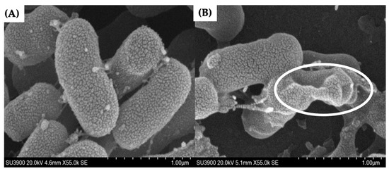 The morphology of A. baumannii cells after exposure to LysAB1245 at subinhibitory concentration was visualized using a scanning electron microscope (SEM). The scanning electron micrographs demonstrated shrinking deformation of the LysAB1245-exposed cells, whereas untreated cells displayed normal rod-shaped morphology with smooth and intact surfaces (Figure 2). Together with previous studies, our study suggests that a lysozyme-like catalytic domain of bacteriophage endolysin is pivotal in disrupting the integrity of the bacterial outer membrane, resulting in the leakage of cytoplasmic content [27,28].