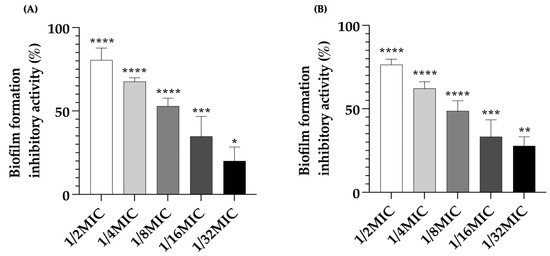 Anti-biofilm effects of LysAB1245 at 1/32-1/2MIC on biofilm formed by P. aeruginosa K1455 (A) and MRSA NPRC 001R (B). Significant reduction in biofilm biomass, compared with control, * p < 0.05, ** p < 0.01 *** p < 0.001, and **** p < 0.0001. Results obtained from two independent experiments performed in triplicate are expressed as mean ± standard deviation (SD).