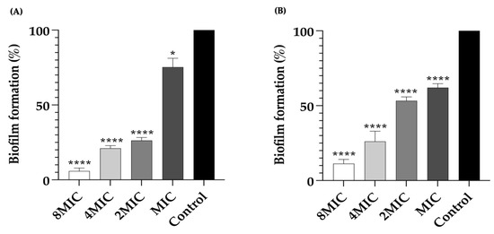 All tested clinical isolates were used to evaluate the biofilm-forming ability as described in a previous study [48]. All bacterial isolates were grown overnight at 37 °C in trypticase soy broth (TSB, Difco) with 0.25% glucose. The cultures were then adjusted to 1 × 108 CFU/mL, inoculated into 96-well microtitre plates (200 μL/well), and incubated at 37 °C for 24 h. The contents of the wells were discarded and gently washed twice with 200 μL PBS. The plates were then dried, stained with 0.1% crystal violet for 30 min, and washed twice with distilled water. After drying of the plates, stained biofilm was dissolved in 100 μL dimethyl sulphoxide (DMSO; Merck, Elkton, VA, USA) and the absorbance was measured at 595 nm using a microplate spectrophotometer. All isolates were assigned into four categories according to the following criteria: optical density at (OD595) < 1, non-biofilm forming; 1 < OD595 < 2, weak; 2 < OD595 < 3, medium; and 3 < OD595, strong.