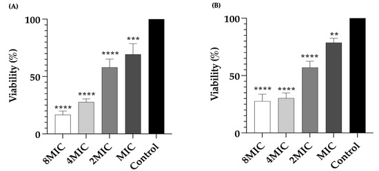 Bacterial viability of 3-day established biofilms formed by P. aeruginosa K1455 (A) and MRSA NPRC 001R (B) after treatment with LysAB1245 at 1–8MICs for 24 h. Significant reduction in biofilm biomass, compared with control, ** p < 0.01 *** p < 0.001, and **** p < 0.0001. Results obtained from two independent experiments performed in triplicate are expressed as mean ± standard deviation (SD).