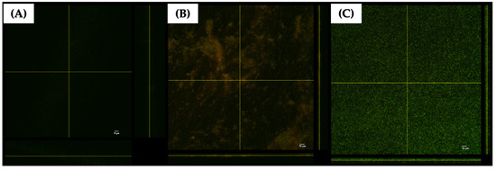 A three-dimensional (3D) structural image of live and dead cells within the matrix of established biofilms formed by a representative strain of P. aeruginosa K1455 on glass surfaces was visualized using confocal laser scanning microscopy (CLSM; Figure 8). The results revealed that LysAB1245 at 4MIC effectively disrupted preformed biofilms (Figure 8A). At 2MIC, a reduction in cell viability was observed, with live cells fluorescing green (Syto 9 dye) and dead cells stained red (propidium iodide) (Figure 8B). In contrast, untreated biofilms displayed dense aggregations of living bacterial cells with green fluorescence (Figure 8C).