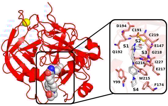 The crystal structure of H. sapiens FXa (red) in complex with a calcium cation (yellow) and an inhibitor; PDB code: 2P16. The inset shows the binding pocket, with key residues highlighted. The binding pocket comprises four subpockets: S1 (constructed by C191, Q192, D194, and I227), S2 (C219), S3 (E147 and G218), and S4 (Y99, F174, W215, G216, and E217).