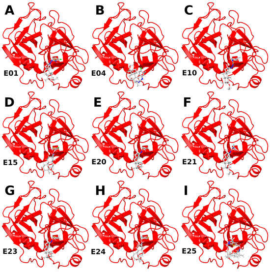 Structures of complexes between ISV derivatives and FXa (red) obtained through docking (A–I). These structures served as the initial configurations for the subsequent MD simulations.