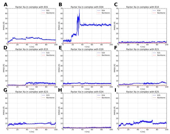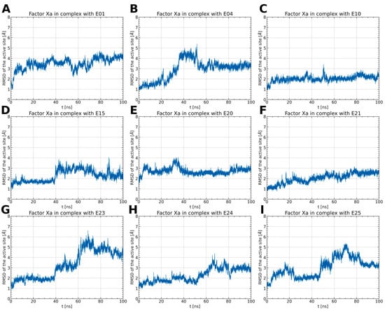 The RMSD changes of amino acids forming the binding pocket (Y99, E147, F174, C191, Q192, D194, W215, G216, E217, G218, C219, and I227) (A–I). The RMSD for FXa complexes with E10, E20, and E21 remains relatively stable, with low values ranging from 2 to 3 Å. In contrast, other complexes show larger RMSD changes, indicating diverse mobility of the ligand-binding site, dependent on the specific type of ligand bound.