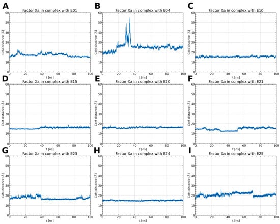 The distance between the CoM of the ligand and the CoM of FXa throughout the simulations (A–I). Typically, the distance remains around 15 to 20 Å, except for the FXa complex with E04. In this case, after 15 ns, the distance increases rapidly, stabilizing at 25 Å. This observation implies the dissociation of the ligand and its potential rebinding at a different site.