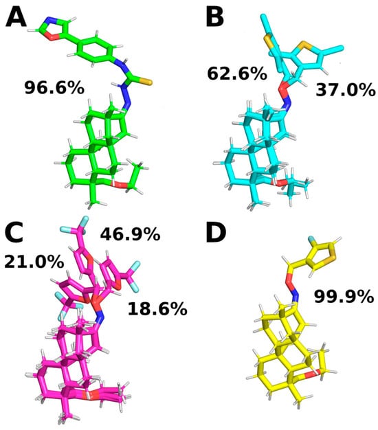 The designed thiourea and oxime ether ISV derivatives are composed of an isosteviol core (fused polycyclic region), and the part based on a phenyl or a five-membered heterocyclic ring. Therefore, the structural similarity of the analyzed compounds to other commercial drugs, i.e., rivaroxaban, apixaban, edoxaban, and betrixaban, is observed. This increases the likelihood of their activity as FXa inhibitors because the analyzed compounds contain additional (compared to ISV) structural fragments responsible for binding the molecule in the active site. These are, for example, five-membered heterocyclic rings present both in most of the designed compounds and the commercial drugs, e.g., thiophen and oxazole rings (as in rivaroxaban and apixaban) and phenyl rings (as in rivaroxaban, apixaban, and betrixaban). Molecular modeling shows that they are important for the interaction of the ligand with the active site [,]. The presence of halogen atoms attached to aromatic rings in most of the described relationships, as in rivaroxaban, edoxaban, and betrixaban molecules, is also important. It was proven that the halogen forms π interactions with the S4 pocket (Y99), which constitutes the key to the pharmacological activity of direct factor Xa inhibitors []. Chlorine atoms are especially responsible for these lipophilic interactions, which was also confirmed by QSAR analyses [,,].