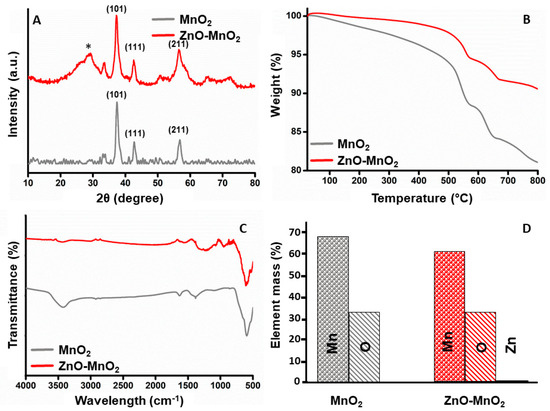 Characterization of nanoparticles. (A) Comparative X-ray diffractogram for the MnO2 NPs (grey line) or ZnO-MnO2 NPs (red line) scanned between 2θ 10 and 80 (* indicates diffraction signal); (B) results from the thermogravimetric analysis of MnO2 NPs (grey line) or ZnO-MnO2 NPs (red line) in the range from 25 °C to 800 °C; (C) Fourier transform infrared spectrum of MnO2 NPs (grey line) or ZnO-MnO2 NPs (red line) in the range from 400 cm−1 to 4000 cm−1; (D) graphical illustration of elemental analysis of the MnO2 NPs (grey) or ZnO-MnO2 NPs (red).