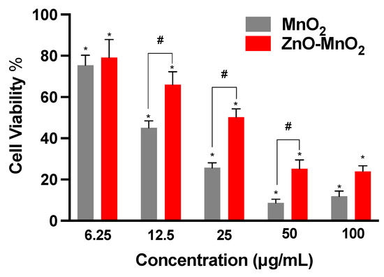 Viability of Raw 264.7 cells following exposure to nanoparticles. Cellular viability was estimated based on the formation of formazan salt after 24 h exposure to MnO2 NPs (grey bars) or ZnO-MnO2 NPs (red bars) within a range of 6.25–100 μg/mL in serum-free media. Independent experiments were carried out at least 3 times (n ≥ 3). A p value of less than 0.05 (p < 0.05) indicates statistical significance between control and treatment groups (*) or between treatment groups (#).