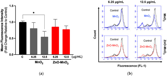 Functional capacity of Raw 264.7 cells following exposure to nanoparticles. (a) Cell phagocytosis capacity was estimated based on the internalization of fluorescently labeled latex beads (4 h) following exposure to 6.25 or 12.5 μg/mL of MnO2 NPs (grey bars) or ZnO-MnO2 NPs (red bars) for 2 h. (b) Representative histograms of the data from the flow cytometer. Independent experiments were carried out at least 3 times (n ≥ 3). A p value of less than 0.05 (p < 0.05) indicates statistical significance between control and treatment groups (*).