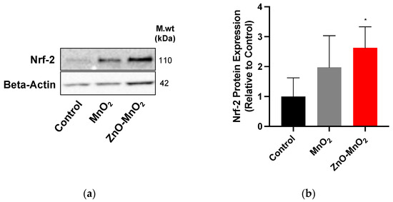 We measured the protein expression of nuclear factor-erythroid 2-related factor 2 (Nrf-2), a central regulator of the cell antioxidant system, following exposure to NPs to assess the activation of the cell antioxidant system. Consistent with ROS data, exposure to ZnO-MnO2 NPs appeared to induce the higher expression of Nrf-2 proteins compared to MnO2 NPs (Figure 6). Together, the data indicate that doping with ZnO led to the generation of more ROS and the consequent activation of the cell antioxidant system, as evidenced by the higher expression of Nrf-2.