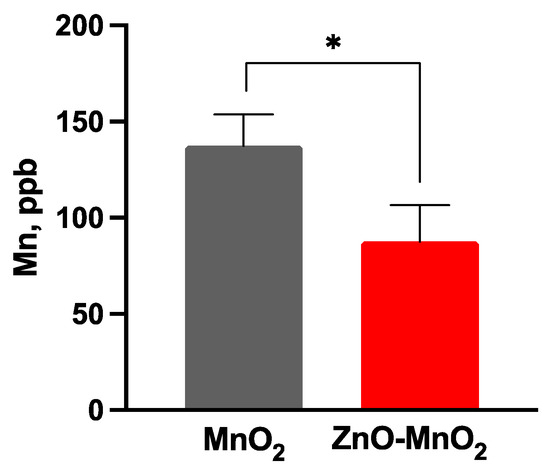 Nanoparticle internalization following exposure to nanoparticles. The cell internalization of the nanoparticle was measured based on the Mn content following treatment with MnO2 NPs (grey bars) or ZnO-MnO2 NPs (red bars) (12.5 μg/mL) for 24 h. Independent experiments were carried out at least 3 times (n ≥ 3). A p value of less than 0.05 (p < 0.05) indicates statistical significance between control and treatment groups (*).