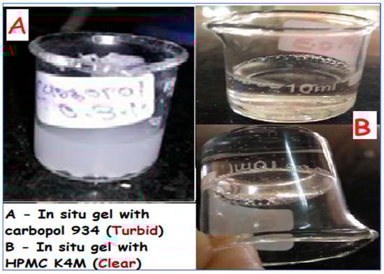 Preparation of thermoreversible in situ gelling systems was conducted via the “cold method” by utilizing Poloxamer 407 and HPMC K4M as gelling agents [16,17]. Poloxamer 407 was dissolved in deionized distilled water at room temperature and then kept overnight at 4 °C to ensure complete solubilization. A separate solution of HPMC K4M was also prepared after its solubilization in water. Both solutions were then mixed, and other excipients were added. Finally, the drug was added with continuous agitation in the above mixture, and the solution was stored overnight at 4 °C. To adjust the final volume, ice-cold distilled water was added. The liquid was then cooled until it was ready for use [18,19,20].