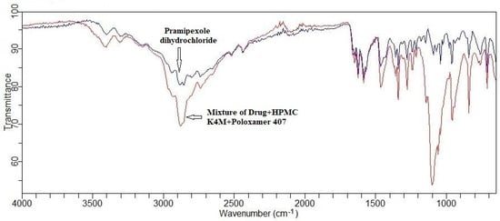 FTIR spectra for a mixture of the drug and excipients as well as the drug in its pure form were recorded using a FTIR spectrophotometer (Cary 630 FTIR Spectrometer, Agilent technologies). The interpretation of the IR scan showed the FTIR spectra of (A) Pramipexole dihydrochloride and (B) the physical drug and excipient mixture.