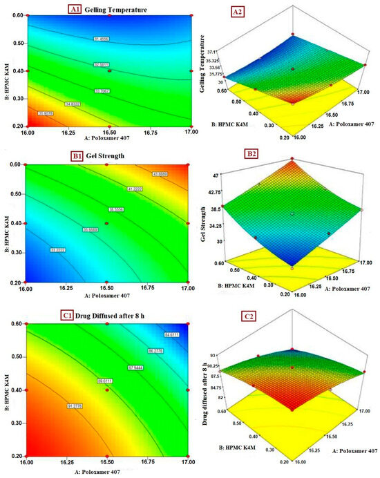 (A1) Contour plot of gelling temperature; (A2) 3D response surface plot of effect of polymer on gelling temperature; (B1) contour plot of gel strength; (B2) 3D response surface plot of effect of polymer on gel strength; (C1) contour plot of drug diffused after 8 h; (C2) 3D response surface plot of effect of polymer on drug diffused after 8 h.