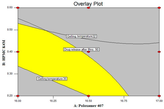 The optimized batch was chosen by applying constraints on gelling temperature (in the range of 34–37 °C), gel strength (maximum), and% drug diffused after 8 h (maximum). The overlay plot, which reflects the yellow region shown in Figure 4, represents the area of the experimental region. According to the Design Expert software, the PG4 formulation, with a concentration of the polymer of Poloxamer 407 (X1) and HPMC K4M (X2) of 16.50% w/v and 0.2% w/v, respectively, tends to be highly desirable. Therefore, this batch was considered as the optimized batch.