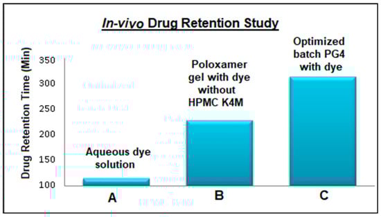 The resultant in vivo drug retention time found for the optimized nasal in situ gel formulation (batch PG4) is shown in Figure 6. The presence of dye in the nasal tissue of the rat was confirmed by taking samples at regular intervals. As the dye appeared on the swab, it indicated the presence of the gel at the site of administration. Plain Poloxamer gel showed a significant drug retention time compared to the control (aqueous dye solution). The formulation containing mucoadhesive polymers displayed significantly higher drug retention for about 5 h versus the plain Poloxamer gel. This study proved that the retention time of the in situ gelling system increases with the addition of HPMC K4M.