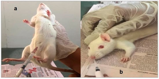 All animal studies were conducted following institutional animal ethics committee approval of the protocol (BIP/IAEC/2018/10). Male Wistar rats were kept in individual metal cages inside the animal house of Babaria Institute of Pharmacy (Varnama, Vadodara, Gujarat, India) with the temperature maintained at 25 °C. All the animals were provided with standard diet and water ad libitum. Six male Wistar rats, having weights ranging from 250 to 320 g, were intraperitoneally injected with urethane solution (1200 mg/kg) to induce anesthesia. An optimized formulation of 5 µL Pramipexole dihydrochloride gel comprising the dye xylene cyanol (3 mg/mL) was injected into the nostril of one of the rats at a depth of 0.5 cm using a micropipette. Cotton-tipped applicators were used to swab the pharyngeal cavities of the rats that received the dose. The swab samples were taken every minute for the first 30 min and then at an interval of 1 h, 1½ h for next 8 h. The samples were visually analyzed. Rats were also given 5 µL of plain Poloxamer gel (lacking mucoadhesive polymer) and 5 µL of dye-loaded fluid (made in normal saline) as controls [31,32]. A pictorial presentation of the administration of anesthesia and the injection of the formulation in the nostril of an experimental subject is given in Figure 7.
