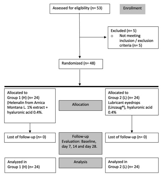 To explore the effect of the studied formulation containing helenalin on the ocular surface health of DED patients, a phase II clinical study to evaluate the efficacy of the ophthalmic formulation was performed. The efficacy study included patients with mild-to-moderate DED meeting all inclusion criteria. Data analysis for 48 subjects, 24 for the Study group (Group 1) and 24 for the Control group (Group 2), completed the follow-up period (Figure 2).