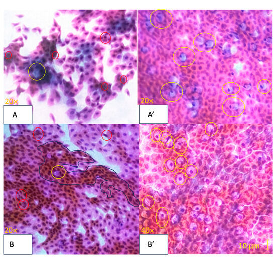 Representative images of Nelson-graded conjunctival impression cytology specimens stained with Papanicolaou stain [37]. Image (A) (Baseline): Stage 0, Nelson Grade 3. Abundant cellularity with 80–100 goblet cells/mm2 (marked by yellow circles). Moderate intercellular separations with a modified cytoplasmicto-nucleus ratio favoring cytoplasm. Mild inflammation and a slight increase in apoptosis (marked by red circles). Image (A’) (1-Month): Stage 0, Nelson Grade 0. Abundant cellularity is evident with more than 400 goblet cells/mm2 (marked by yellow circles). The cells are cohesive. There is a balanced cytoplasmic-to-nuclear ratio. No inflammatory cells or apparent apoptosis are observed. Image (B) (Baseline): Stage 0, Nelson Grade 2. Abundant cellularity with goblet cells ranging from 200 to 300 cells/mm2 (marked by yellow circles). Frequent slight intercellular separations with a modified cytoplasmic–nucleus relationship favoring cytoplasmic features. Mild inflammation and metaplasia (surrounded by a blue perimeter) are noted, along with a slight increase in apoptosis (marked by red circles). Image (B’) (1-Month): Stage 0, Nelson Grade 1. Abundant cellularity with goblet cells ranging from 300 to 400 cells/mm2 (marked by yellow circles). The cells are cohesive or with discrete intercellular separations. There is a balanced cytoplasmic-to-nuclear ratio. Minimal inflammation and minimal apoptosis are observed.