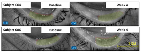 Representative images of 2 patients of the studied formulation group (Group 1) of meibomiography, taken with the Schwind Sirius®, that show notable improvement between baseline and week 4. This significative improvement was not observed in the Control group (Group 2).