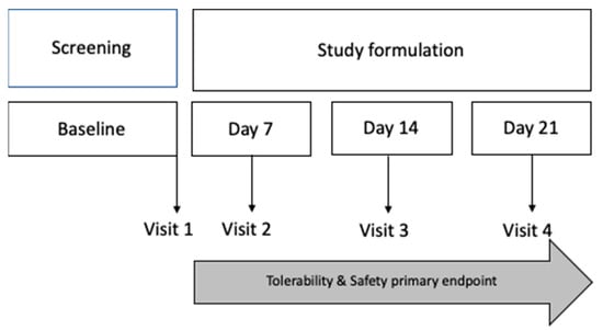 Tolerability and safety evaluation design. The safety and tolerability evaluation included the collection and summary of adverse events. Primary tolerability and safety analysis took place at visit 2 (day 7), visit 3 (day 14), and visit 4 (day 21).