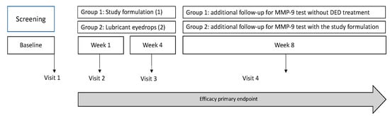A certified technician conducted BCVA measurement, while a blinded clinical investigator performed safety and efficacy assessments. A crossover design included a 4-week follow-up for MMP-9 testing, with Group 1 discontinuing the formulation and Group 2 initiating it without a washout period.