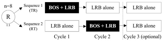 Study design. Note: Eight evaluable patients were planned to be enrolled in the study. Finally, eleven patients were included and treated: seven in Sequence 1 [TR] and four in Sequence 2 [RT]. BOS, bosentan; LRB, lurbinectedin; R; randomized; RT, Reference–Test; TR, Test–Reference.
