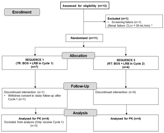 CONSORT flow diagram for the trial. * Calculated according to the Cockcroft and Gault’s formula. BOS, bosentan; CLcr, creatinine clearance, LRB, lurbinectedin; RT, Reference–Test (BOS + LRB in Cycle 2); TR, Test–Reference (BOS + LRB in Cycle 1). PK, pharmacokinetics.