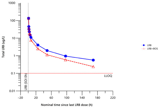 Mean unbound plasma concentration–time profile of lurbinectedin with (n = 6) or without (n = 6) bosentan. Two patients were excluded from this analysis due to extremely high unbound fraction values. BOS, bosentan; h, hour; LLOQ, lower limit of quantitation; LRB, lurbinectedin; SOI, start of infusion.