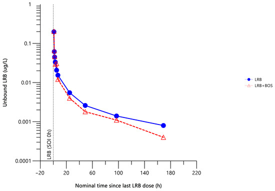 The mean unbound plasma concentration–time profiles of lurbinectedin administered alone and with bosentan are presented in Figure 4.