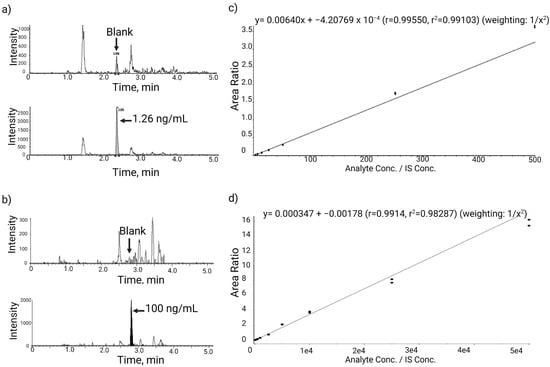 Representative LC-MS/MS chromatograms of blank and LLOQ standards and calibration curves for vitreous low- and high-concentration assays. (a) Blank and LLOQ of 1.26 ng/mL calibration standard from the low-concentration assay. Negligible interference peaks were observed in the vitreous blank at retention times of interest for EGVSAIR. There was an interference peak height of 500 cps, far lower than that (4500 cps) of the LLOQ standard. (b) Blank and LLOQ of 100 ng/mL calibration standard from the high-concentration vitreous humor assay. (c) Calibration curve of vitreous low-concentration curve with a range of 1.26–500 ng/mL. (d) Calibration curve of vitreous high-concentration curve with a range of 100–50,000 ng/mL.