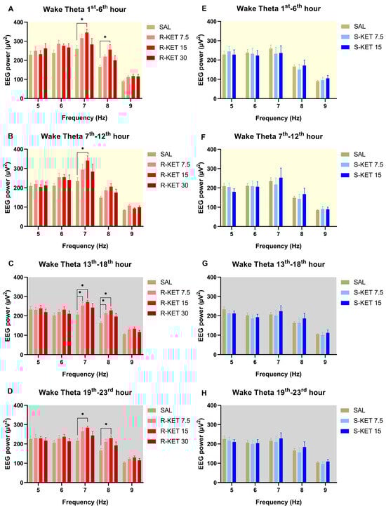 Effects of (R)-ketamine [7.5, 15, 30 mg/kg i.p., (R)-KET], (S)-ketamine [7.5, 15 mg/kg i.p., (S)-KET], and vehicle (saline, SAL) on EEG theta power (5–9 Hz) for 23 h following administration shown in 6-h periods during wakefulness. Effects of (R)-ketamine on theta power are shown in the (A) 1st–6th hours, (B) 7th–12th hours, (C) 13th–18th hours, and (D) 19th–23rd hours after administration. Effects of (S)-ketamine on theta power are shown in the (E) 1st–6th hours, (F) 7th–12th hours, (G) 13th–18th hours, and (H) 19th–23rd hours after administration. Significant results are indicated by * (compared with vehicle, p < 0.05). The background colors indicate the passive (yellow—lights on) and the active (grey—lights off) phases. Results are presented as mean ± SEM (n = 6–8 rats per group).