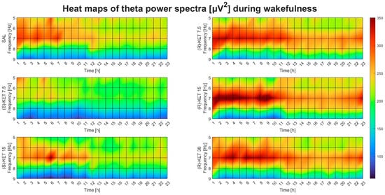 Theta EEG power was assessed during wakefulness and REM sleep but not during NREM sleep since this frequency band has been shown to be more important in these vigilance stages [14,15,16]. The statistical analysis was carried out and the graph bar figures were created using Prism 8 (GraphPad, San Diego, CA, USA). Power values for each frequency (5–9 Hz) were averaged per 6 h for each dose of (R)-ketamine and (S)-ketamine in wakefulness and REM sleep separately. Then, two-way ANOVA (two main factors: treatment and frequency) was performed on all three (R)-ketamine doses compared to saline and both (S)-ketamine doses compared to saline in wakefulness and REM sleep separately. For multiple comparisons, the Bonferroni post hoc test was carried out. A p-value of < 0.05 was accepted as statistically significant. Heat map figures were created using a custom script written in Matlab 9.13.0.2049777 (MathWorks, Natick, MA, USA) with the aim of visualizing data, but they do not demonstrate statistical results.