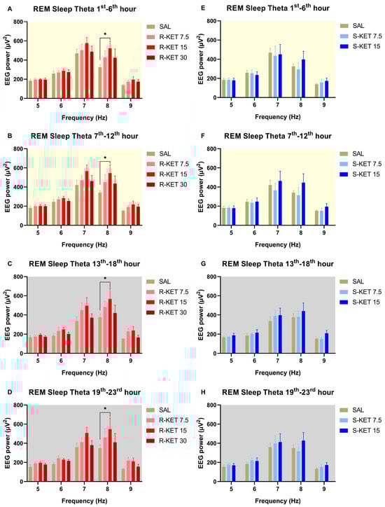 Effects of (R)-ketamine [7.5, 15, 30 mg/kg i.p., (R)-KET], (S)-ketamine [7.5, 15 mg/kg i.p., (S)-KET], and vehicle (saline, SAL) on EEG theta power (5–9 Hz) for 23 h following administration shown in 6-h periods during REM sleep. Effects of (R)-ketamine on theta power are shown in the (A) 1st–6th hours, (B) 7th–12th hours, (C) 13th–18th hours, and (D) 19th–23rd hours after administration. Effects of (S)-ketamine on theta power are shown in the (E) 1st–6th hours, (F) 7th–12th hours, (G) 13th–18th hours, and (H) 19th–23rd hours after administration. Significant results are indicated by * (compared with vehicle, p < 0.05). The background colors indicate the passive (yellow—lights on) and the active (grey—lights off) phases. Results are presented as mean ± SEM (n = 6–8 rats per group).
