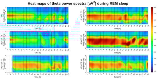 Effects of (R)-ketamine [7.5, 15, 30 mg/kg i.p., (R)-KET], (S)-ketamine [7.5, 15 mg/kg i.p., (S)-KET], and vehicle (saline, SAL) on EEG theta power (5–9 Hz) for 23 h following administration during REM sleep. White boxes indicate that the given treatment caused REM sleep suppression; to such a degree that quantitative EEG analysis could not be performed.